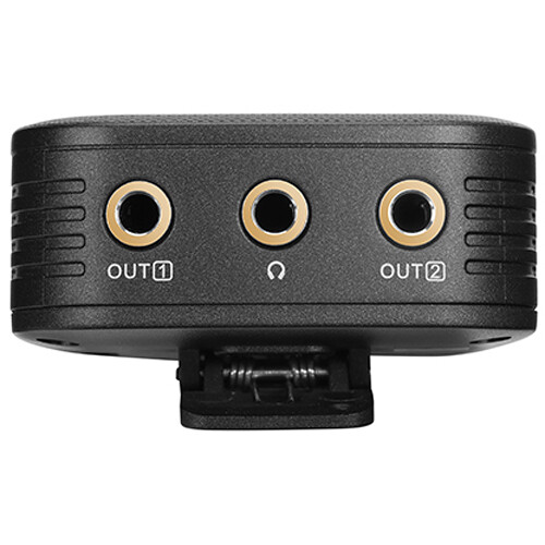 The receiver features a belt clip and shoe mount for easy attachment to cameras or smartphones. The OLED display offers real-time metering and quick adjustments. It supports mono and stereo output modes with multiple 3.5mm audio outputs for monitoring and multi-track recording.