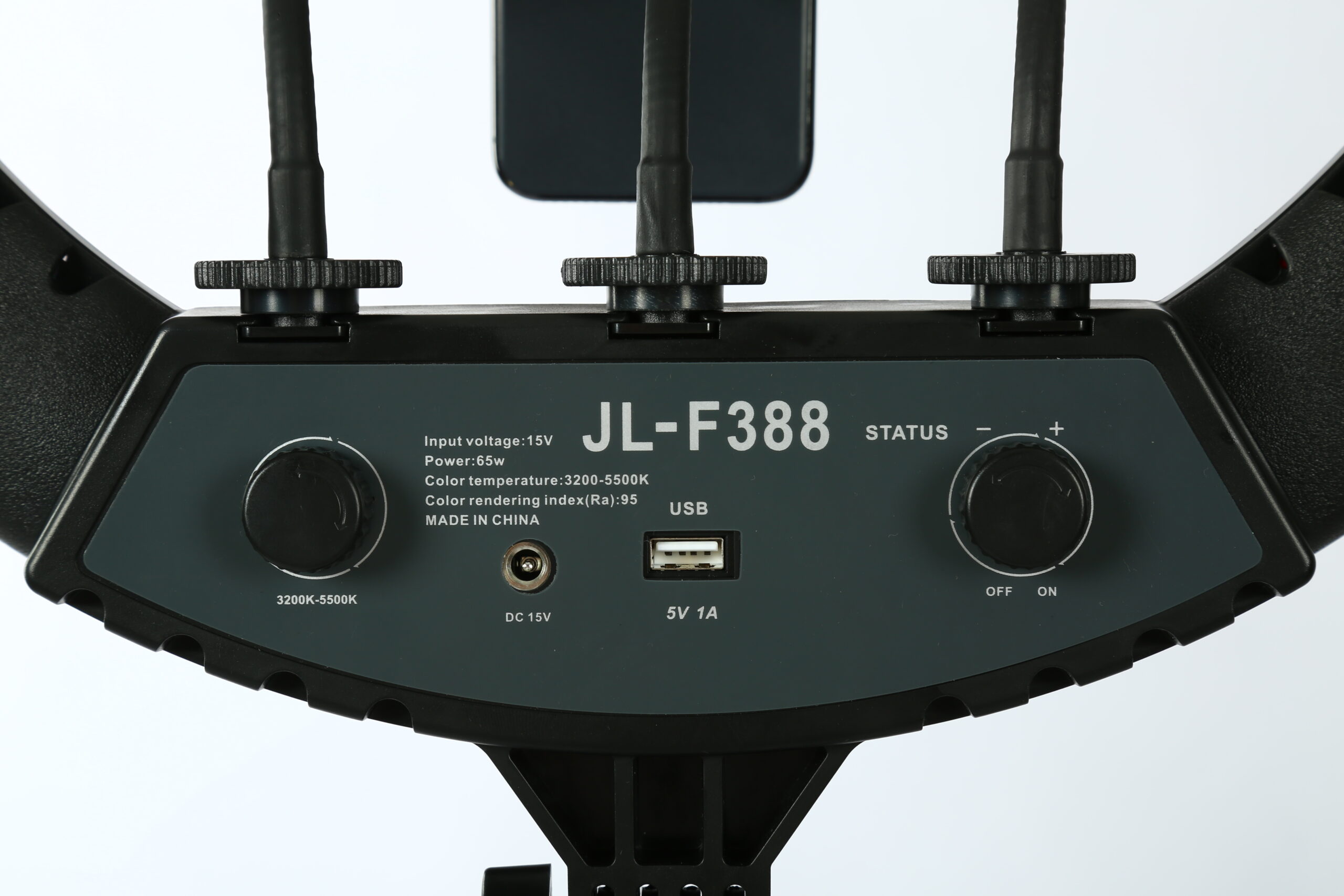 The JL F388 LED Ring Light is designed to elevate your creative work. Its large 18-inch diameter provides soft, even lighting that reduces shadows and highlights details, making it perfect for portrait, product, and macro photography. With stepless dimming and adjustable color temperature, you can easily match any studio or natural light conditions. The high CRI of 95 guarantees accurate color rendering, ensuring your videos and photos look professional and vibrant.