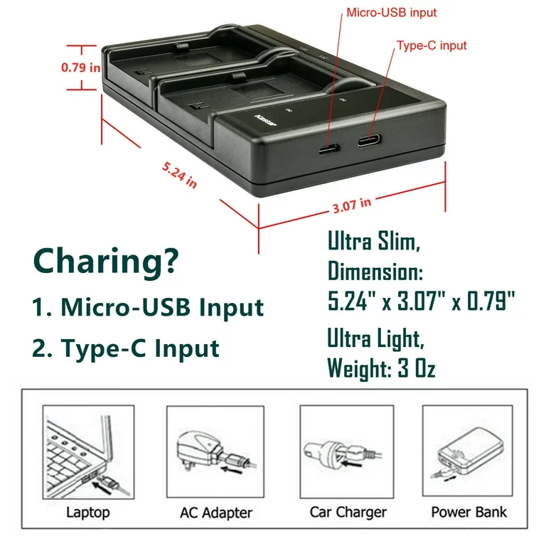 This charger supports charging two Canon camera batteries simultaneously, enhancing workflow efficiency for professionals and enthusiasts. Compatible with multiple Canon battery and charger models, it also supports USB Type-C and Micro-USB input, providing versatile charging options.