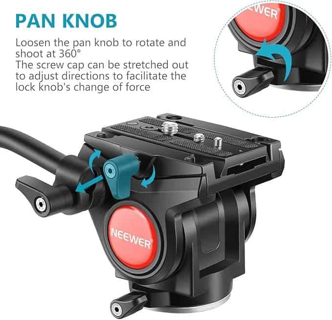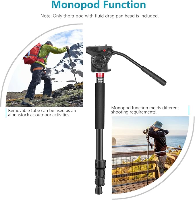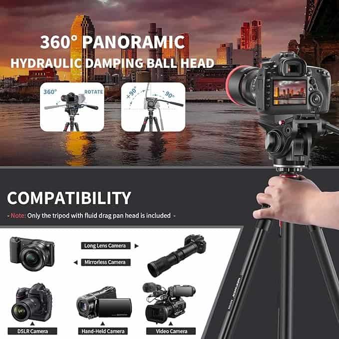 The fluid head provides 360° rotation and tilt drag control, allowing smooth, precise camera movements essential for video recording and panoramic shots.