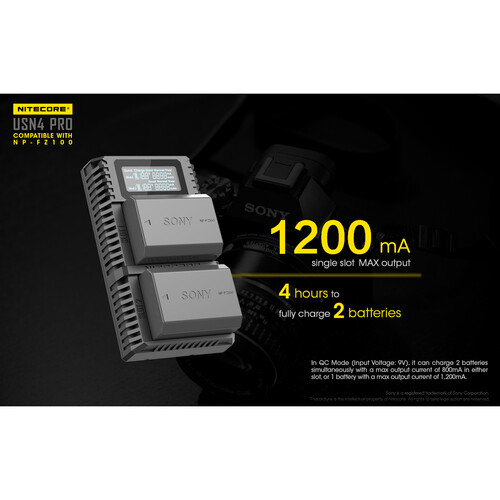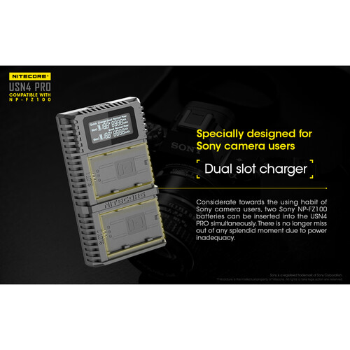 Designed specifically for Sony NP-FZ100 batteries, the Nitecore USN4 PRO charger provides simultaneous charging for two batteries through its dual slots. It supports quick charge mode with a maximum output of 1.2A per slot and features a clear LCD display for real-time battery information. Its compatibility with USB power sources like laptops and power banks makes it perfect for travel and outdoor photography sessions.