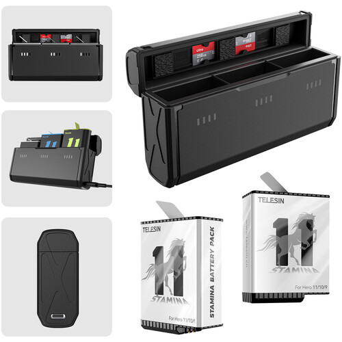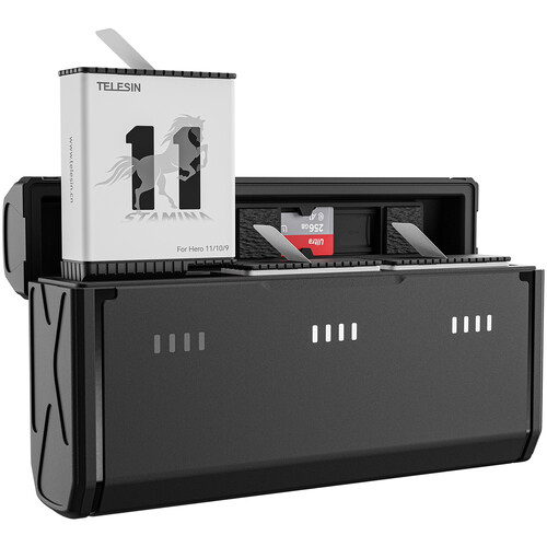 The TELESIN 3-Channel Pocket Charger Kit is specially designed for GoPro HERO11, HERO10, and HERO9 Black cameras. It allows you to charge, store, and transport your batteries safely, making it an essential accessory for long shoots and travel.