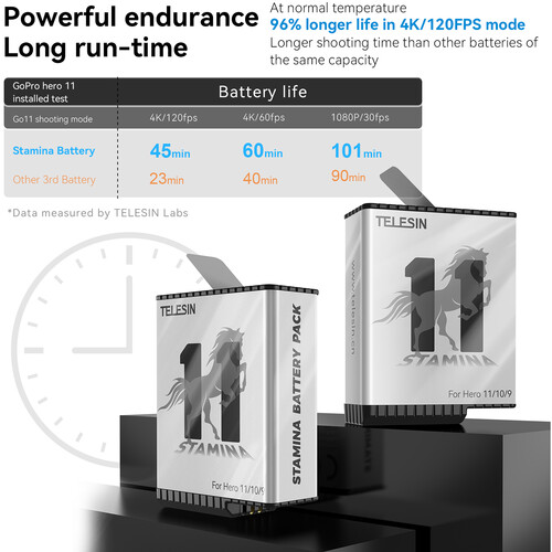 Each Stamina battery offers a 1720mAh capacity, delivering longer recording times compared to standard GoPro batteries. At normal temperatures, users can enjoy up to a 96% performance boost for 4K120 video recording.